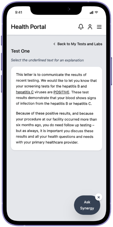 We designed “Synergy,” an AI assistant embedded directly within the patient portal.